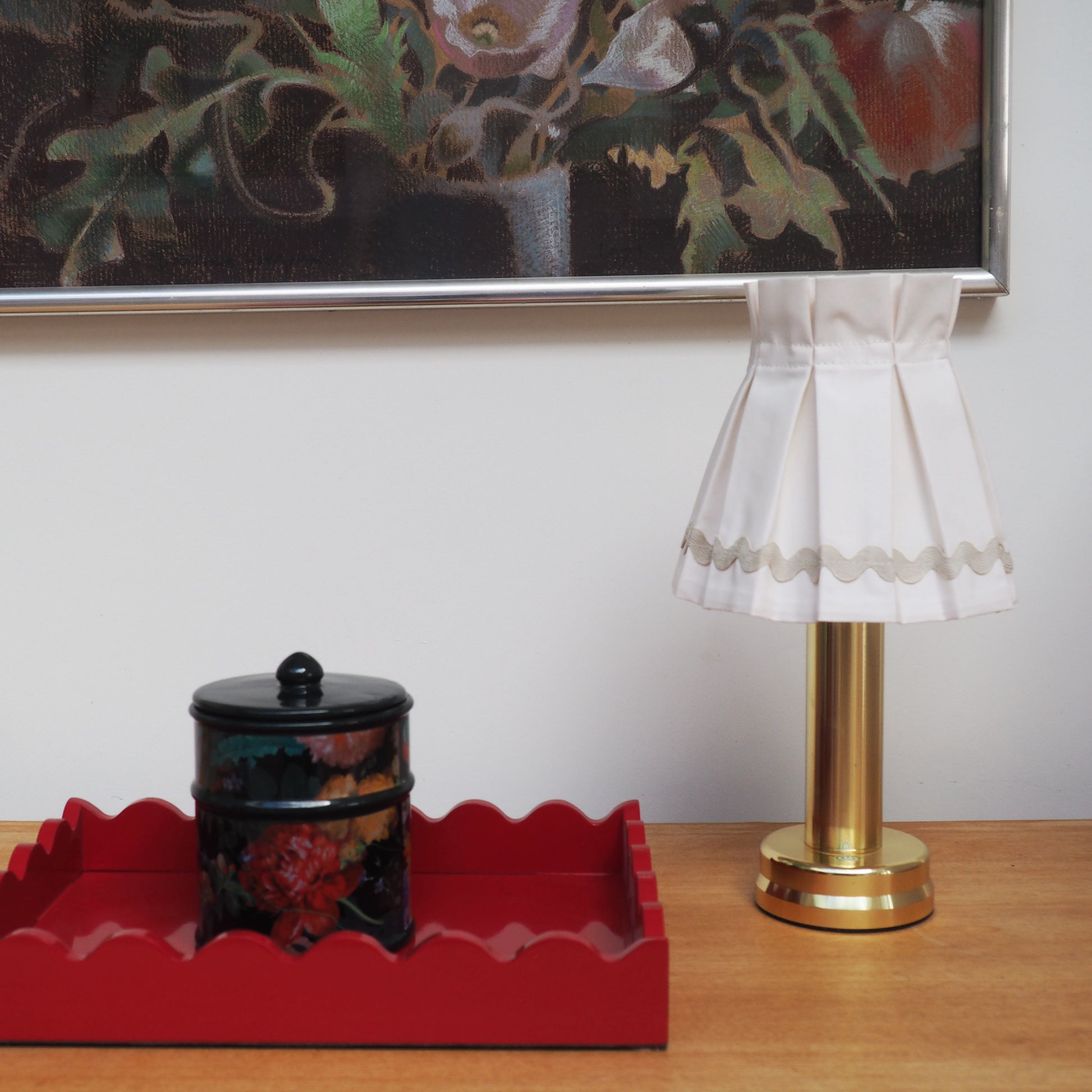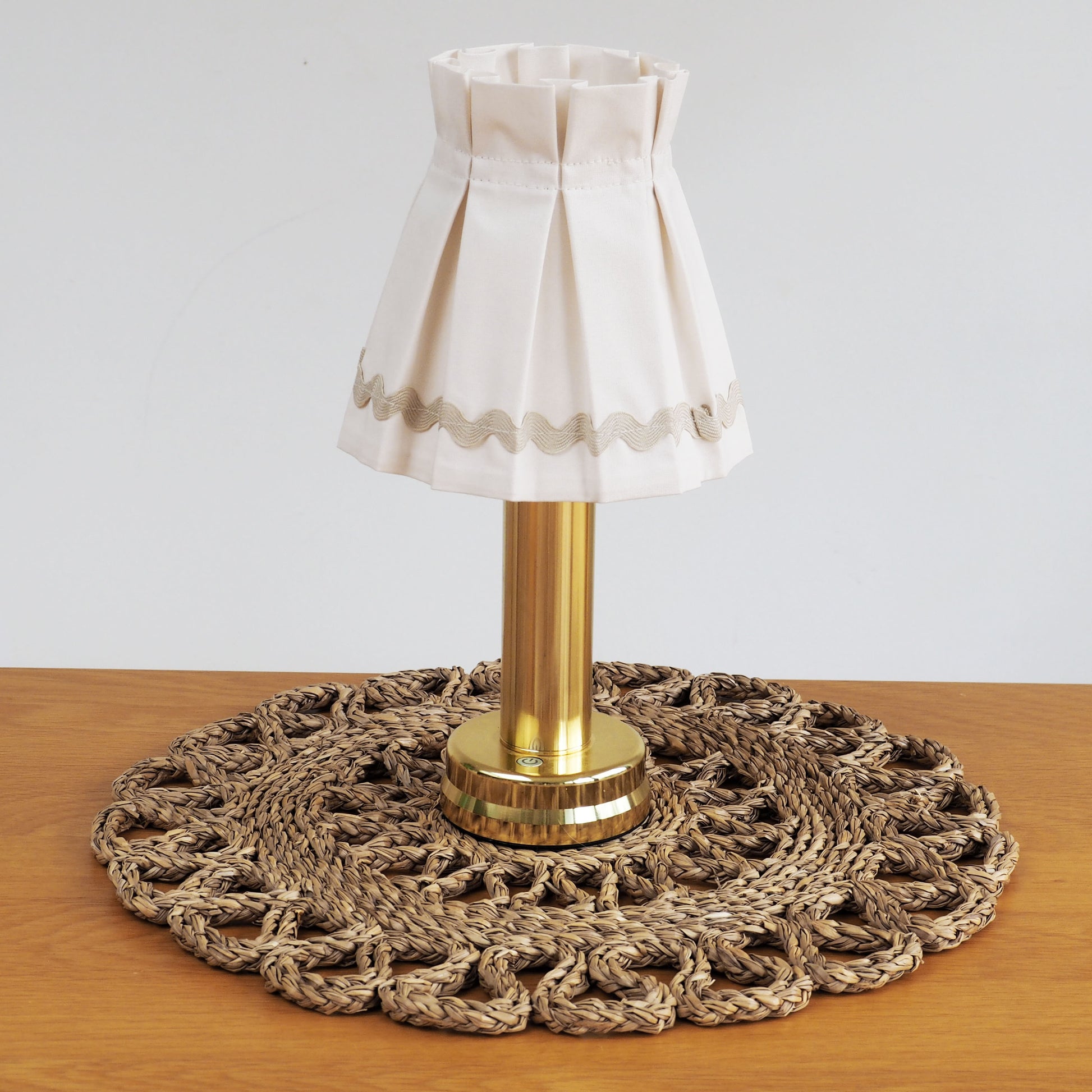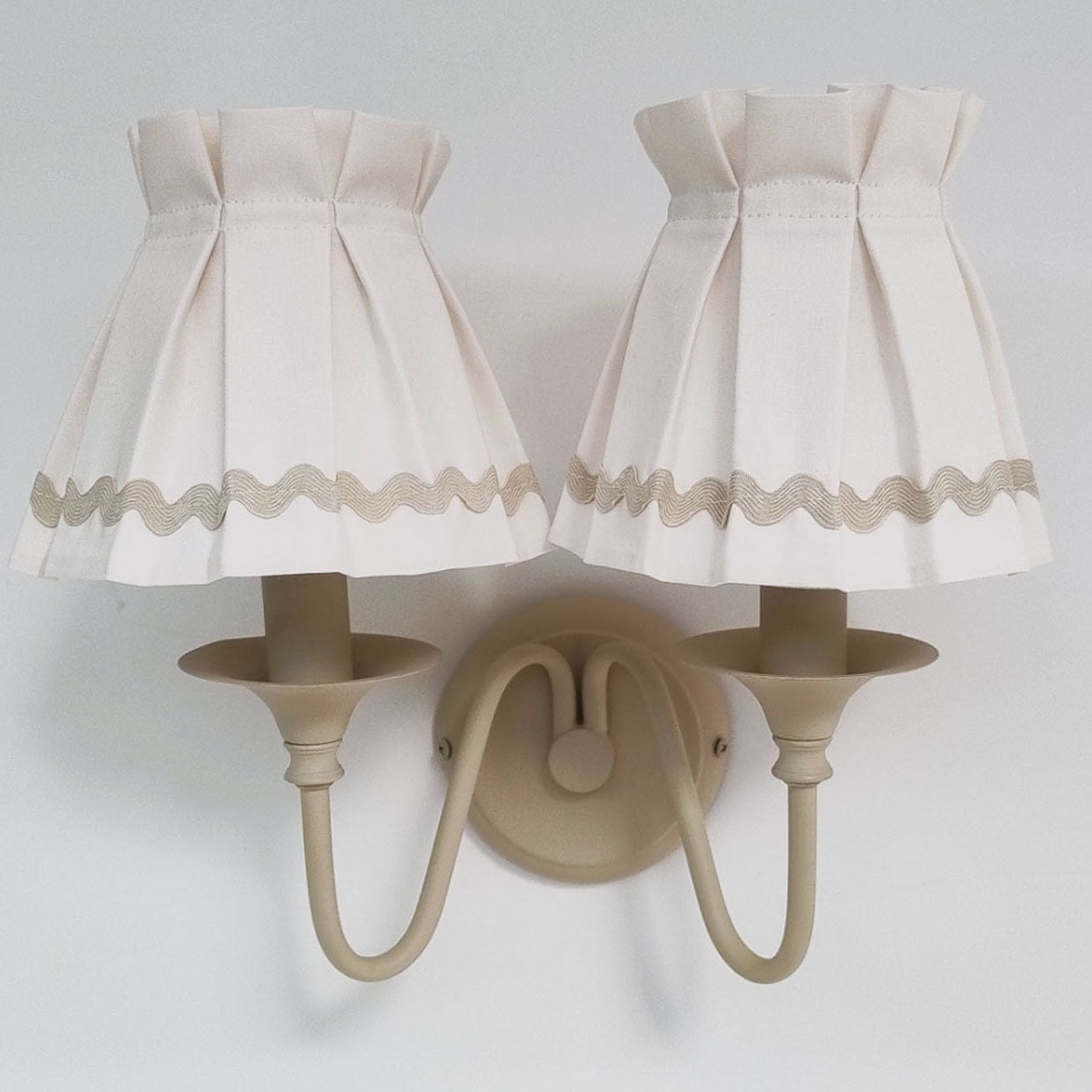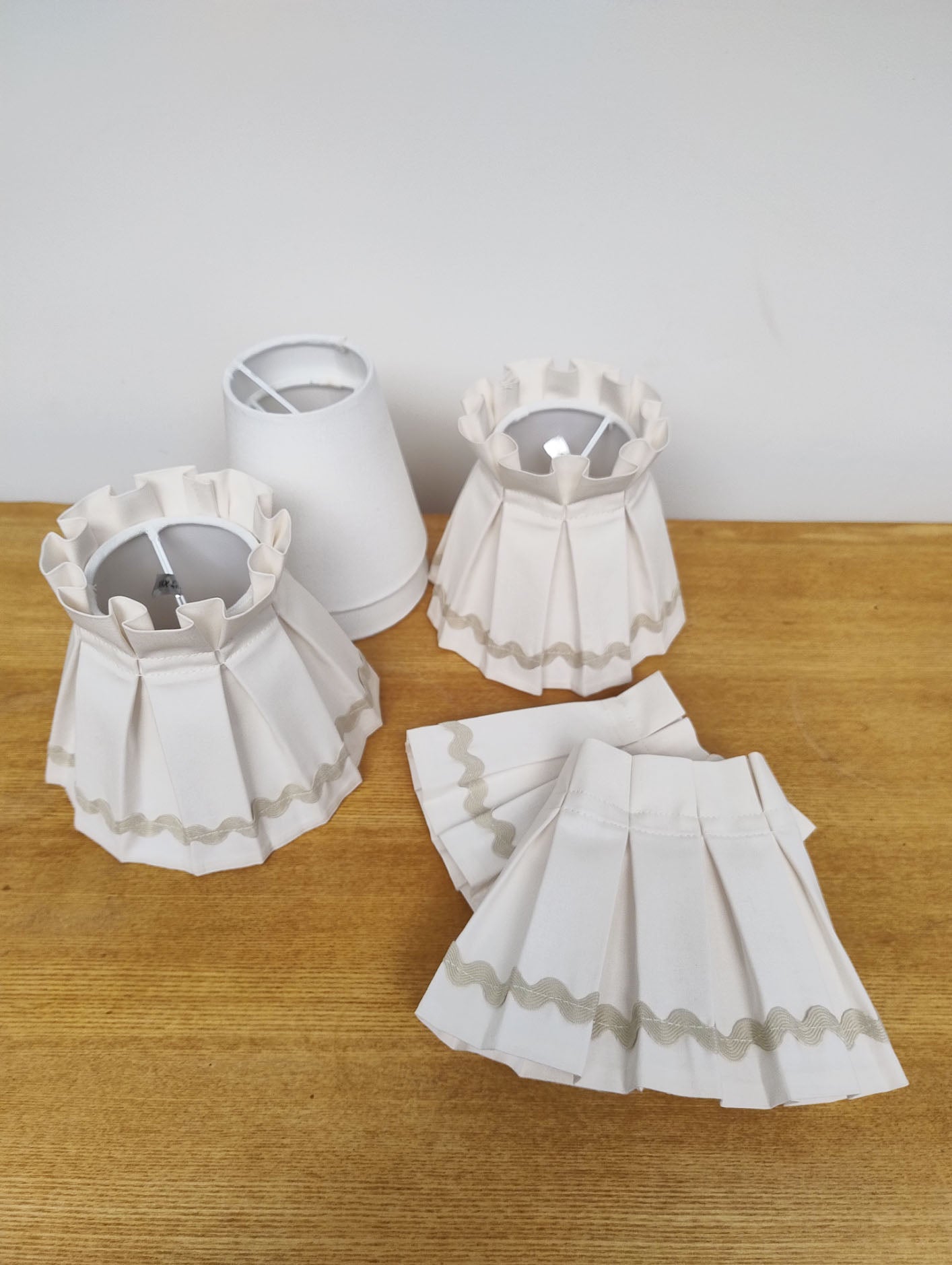 Handmade candle clip box 100% cotton ivory fabric loose lampshade cover skirt with beige ric rac trim. It sits over a plain candle clip shade and comes complete with shade. Candle clip shades sit directly on top of a candle shape bulb. Ric rac trim is available in other colours, please message me.
