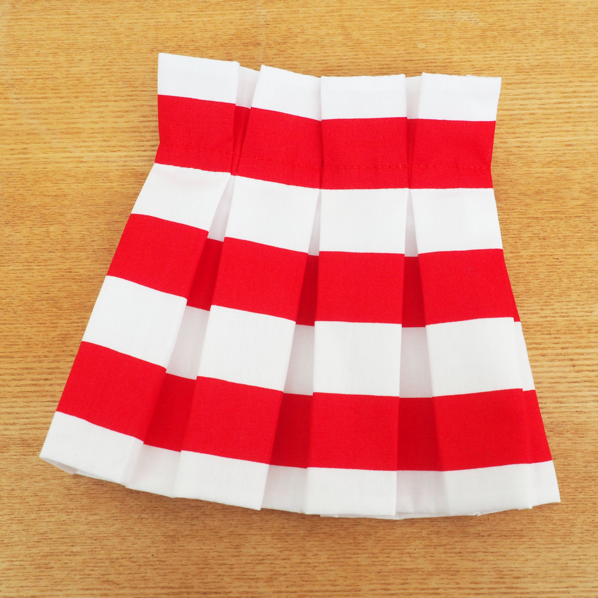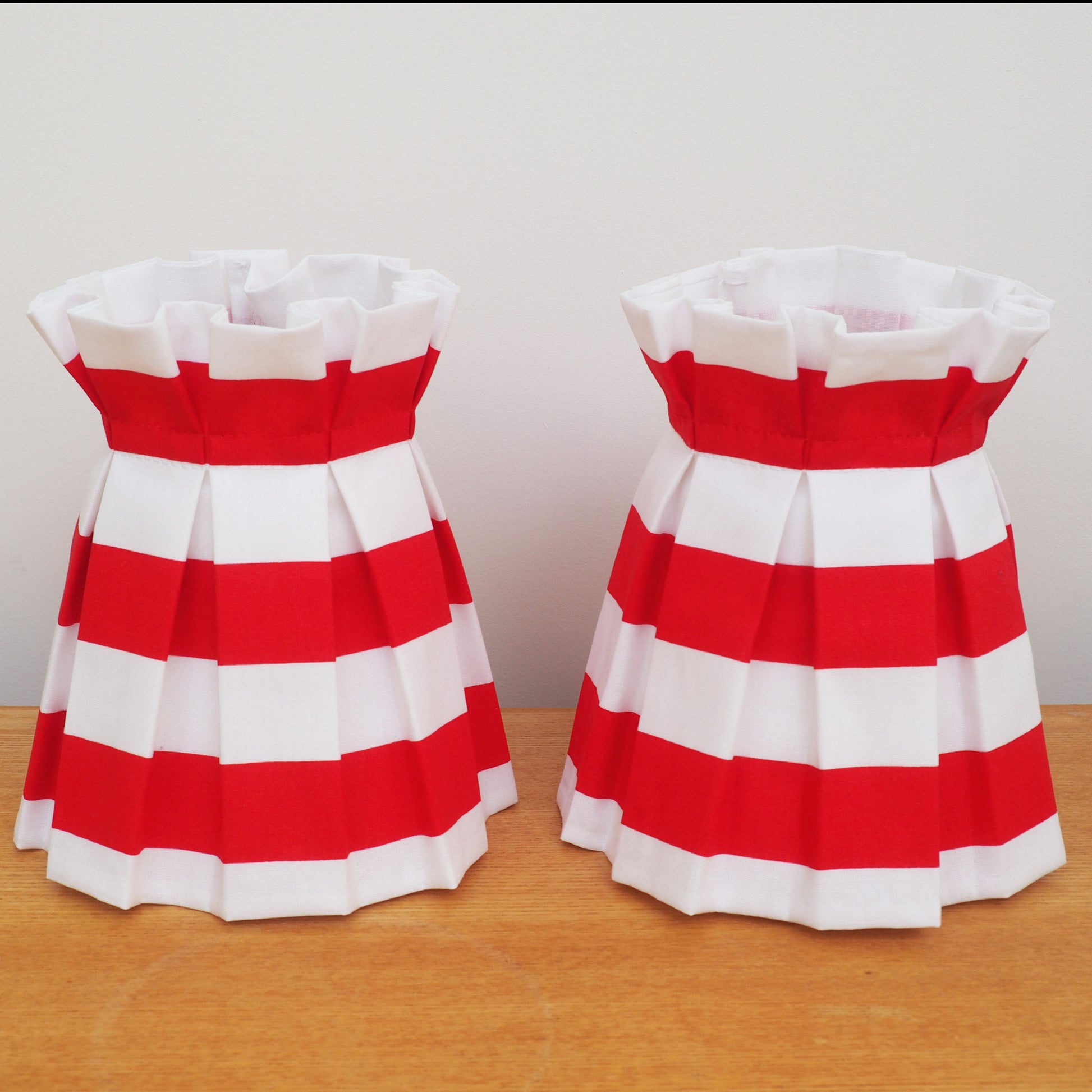 Handmade candle clip box pleat red and white fabric loose lampshade cover skirt which sits over a plain cream candle clip shade (comes complete with shade). Candle clip shades sit directly on top of a candle shape bulb.