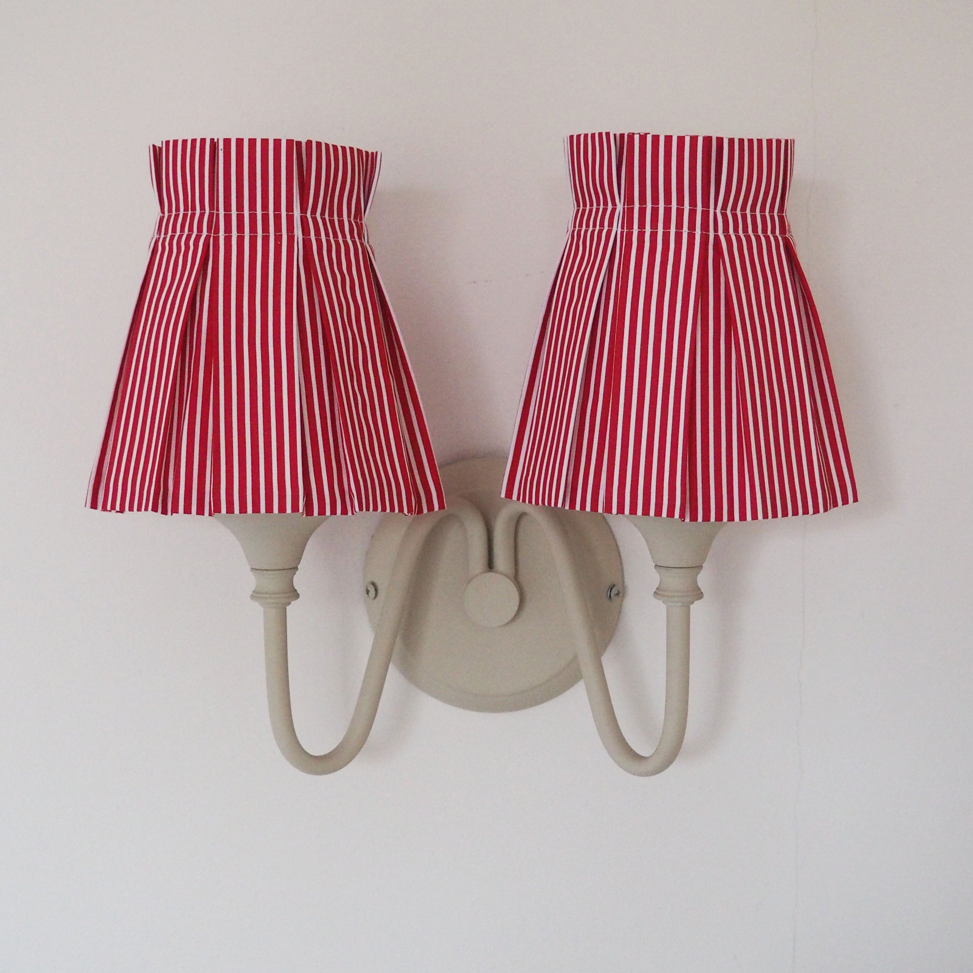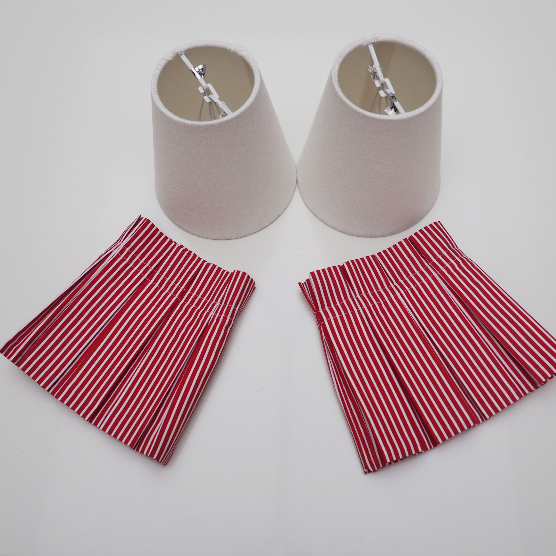 Handmade candle clip box pleat red and white candy stripe fabric loose lampshade cover skirt which sits over a plain cream candle clip shade (comes complete with shade). Candle clip shades sit directly on top of a candle shape bulb. Also available in blue stripe.