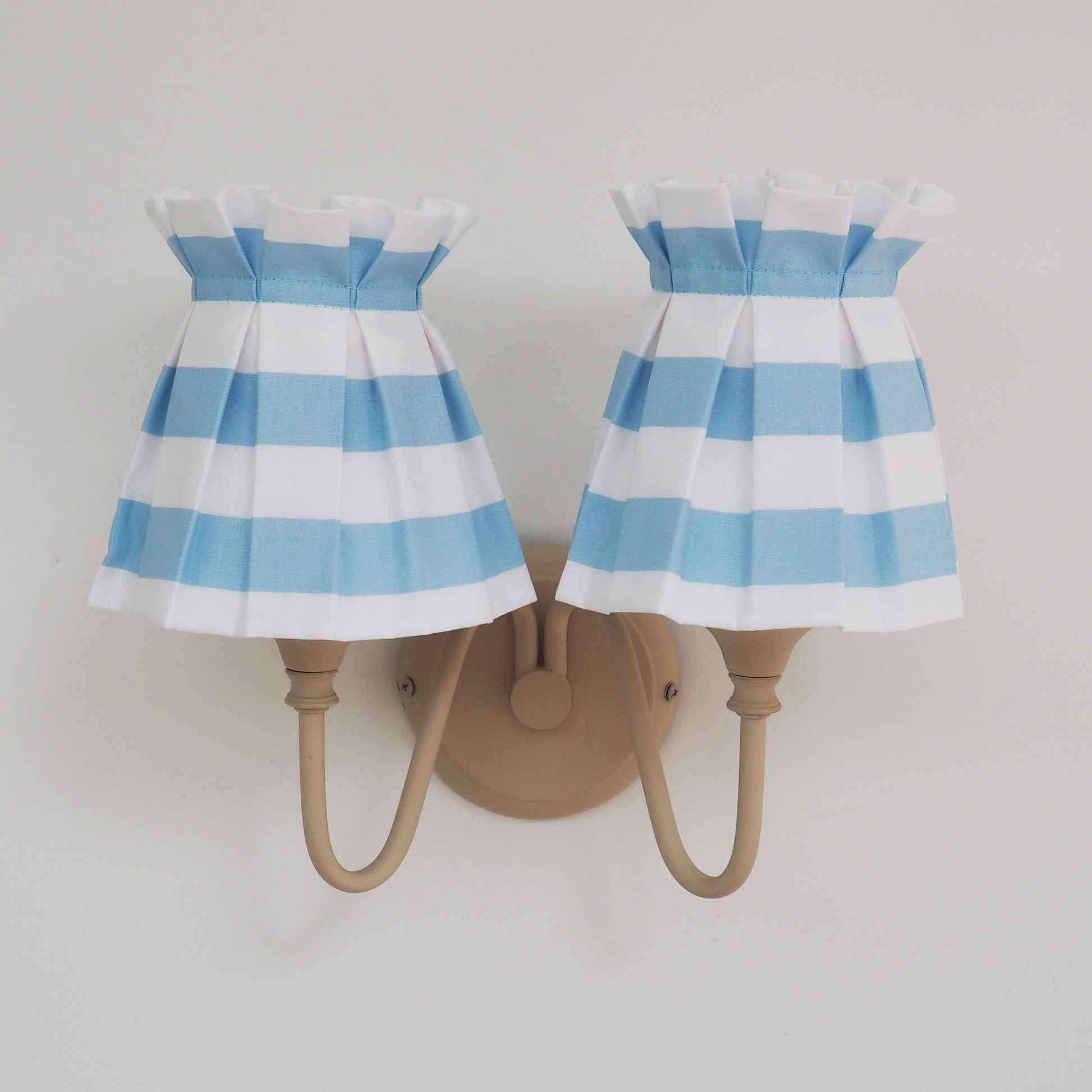 Handmade candle clip box pleat sky blue and white fabric loose lampshade cover skirt which sits over a plain cream candle clip shade (comes complete with shade). Candle clip shades sit directly on top of a candle shape bulb.