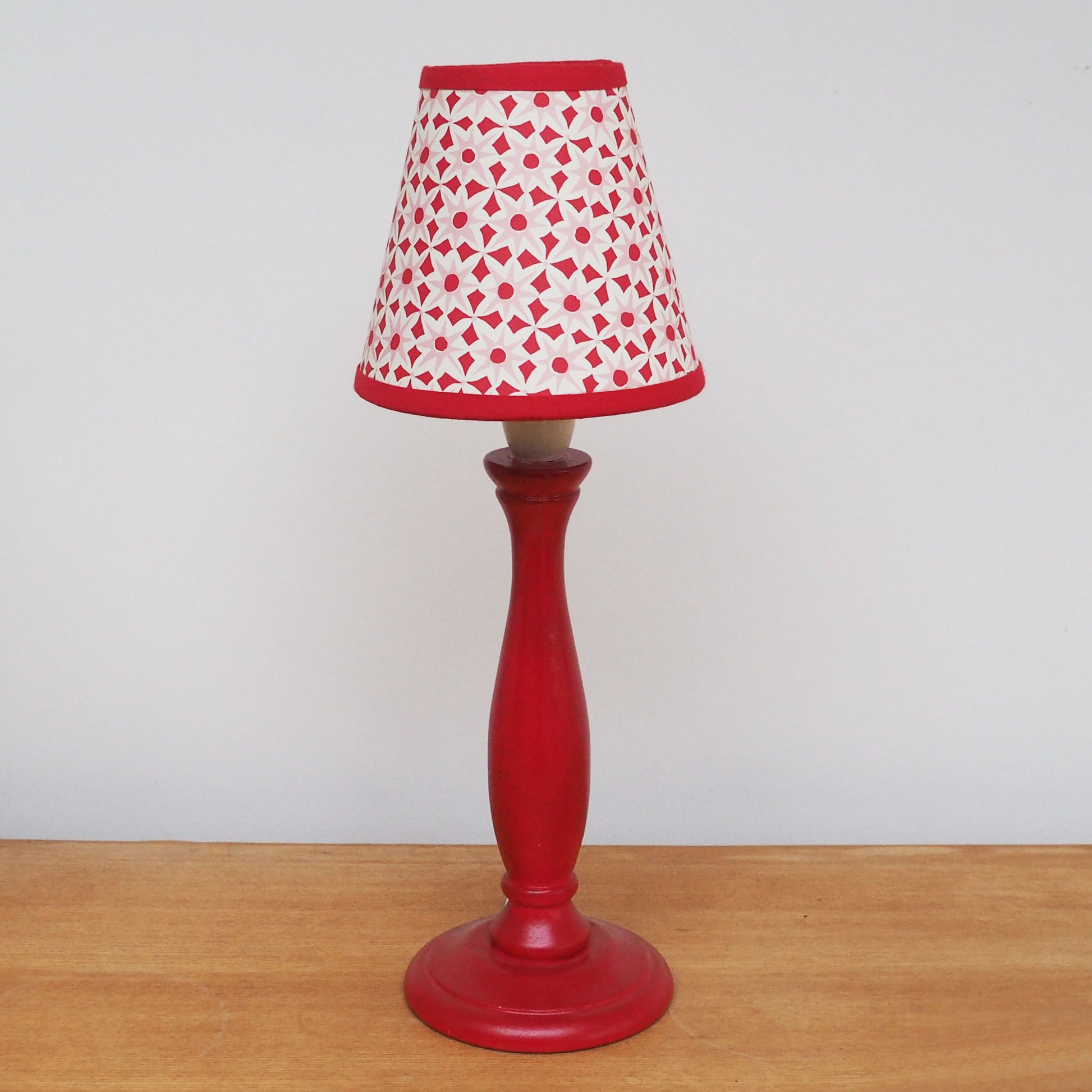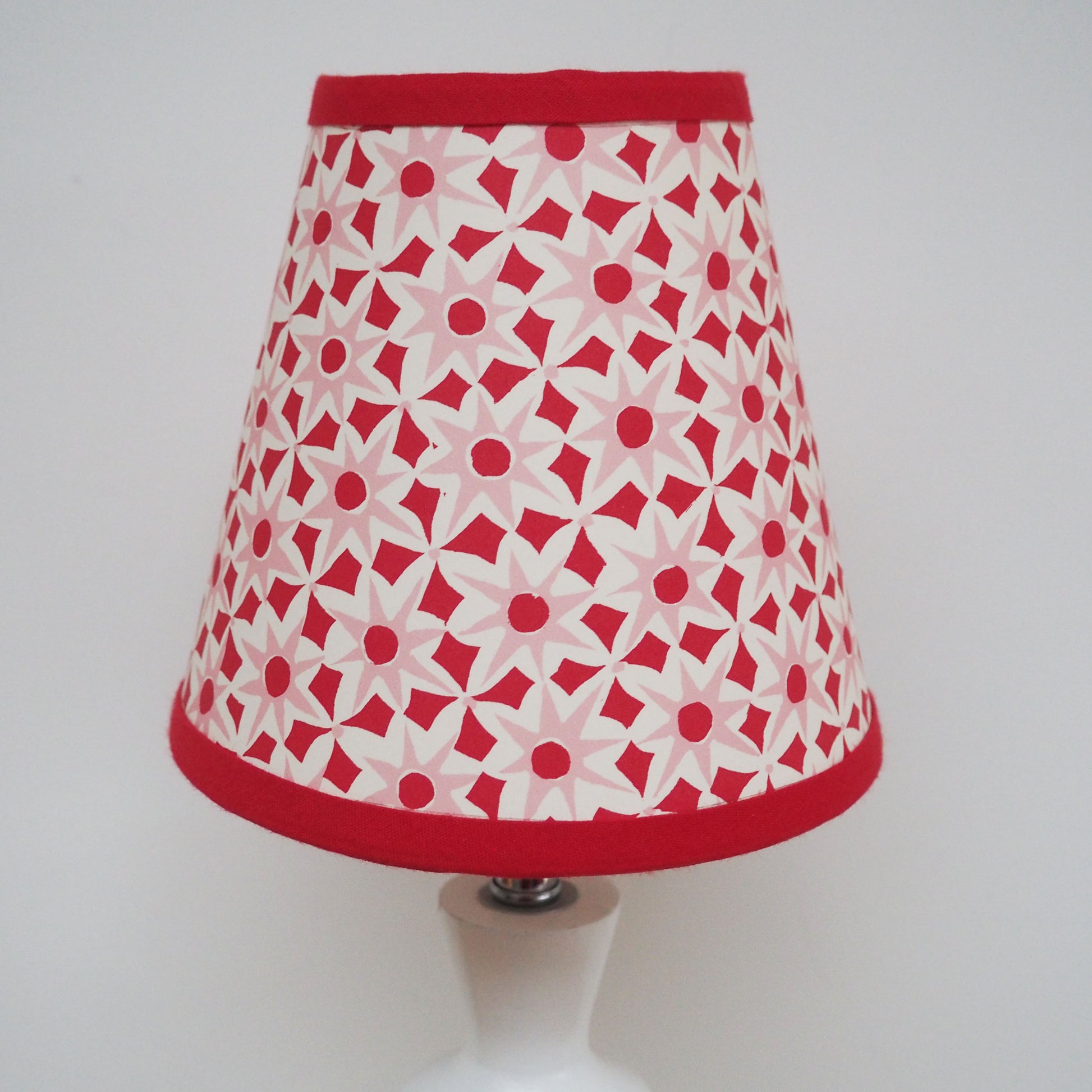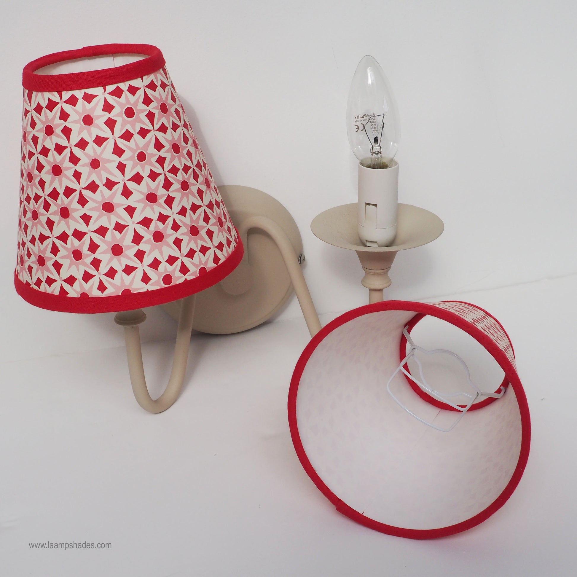 Handmade candle clip lampshade made using Cambridge Imprint patterned paper Alhambra in pink and red with matt finish with a red cotton bias binding on the top and bottom edges. Candle clip shades sit directly on top of a candle shape bulb only - usually used for wall lights and chandeliers and can be used on small lamp bases too.