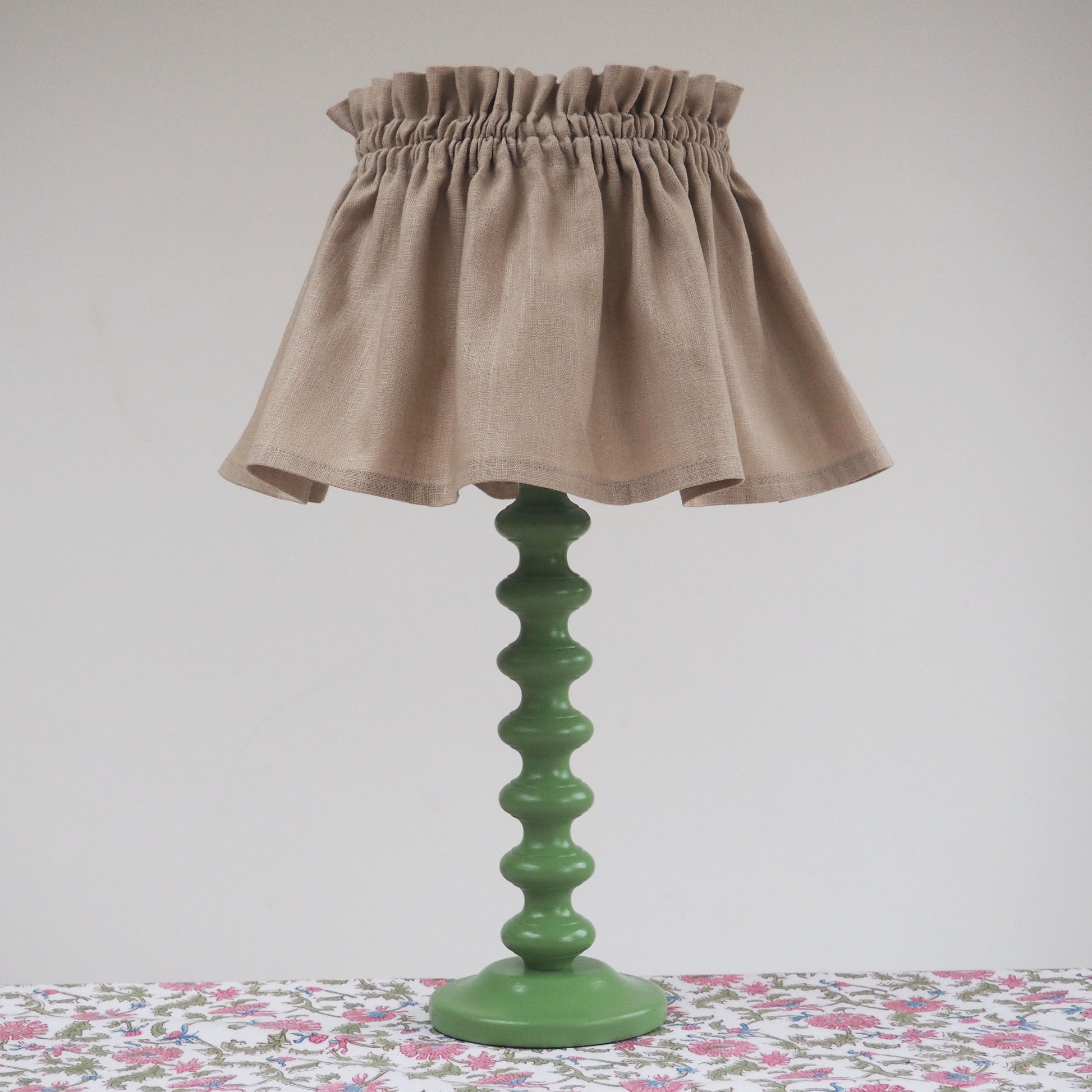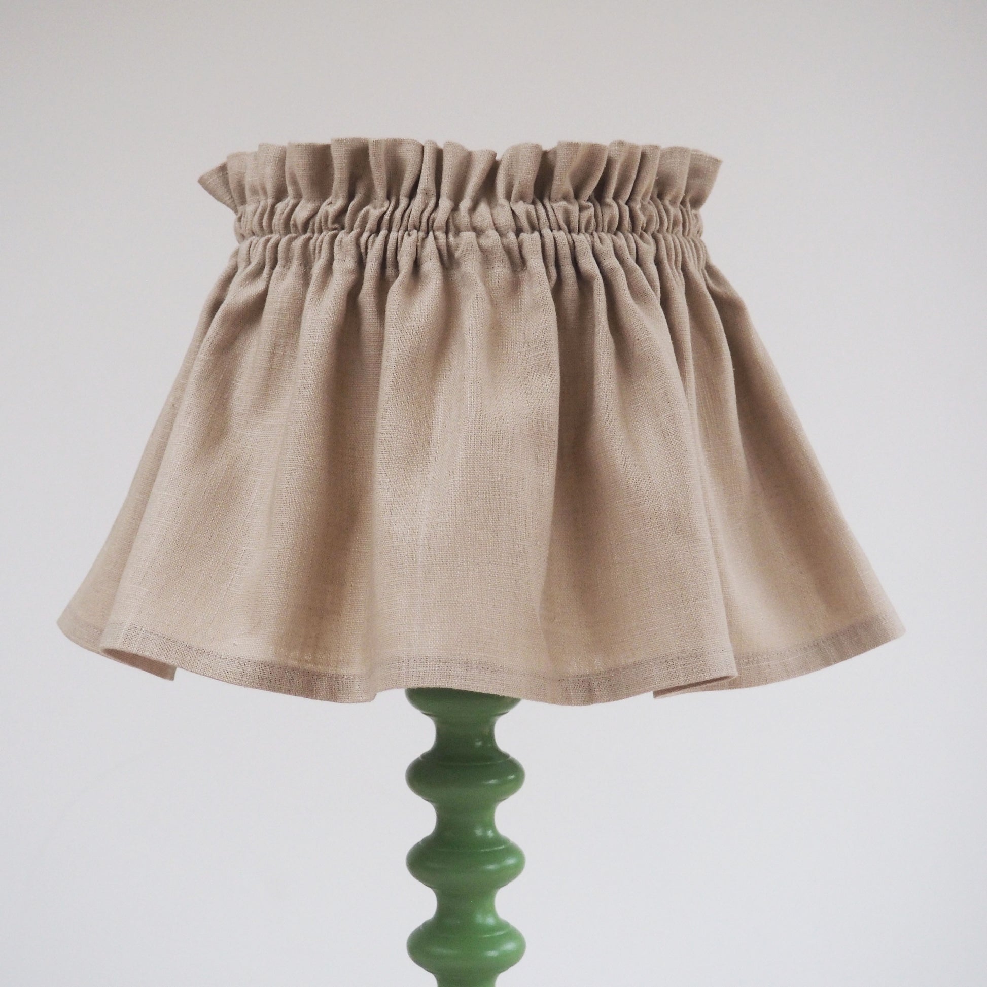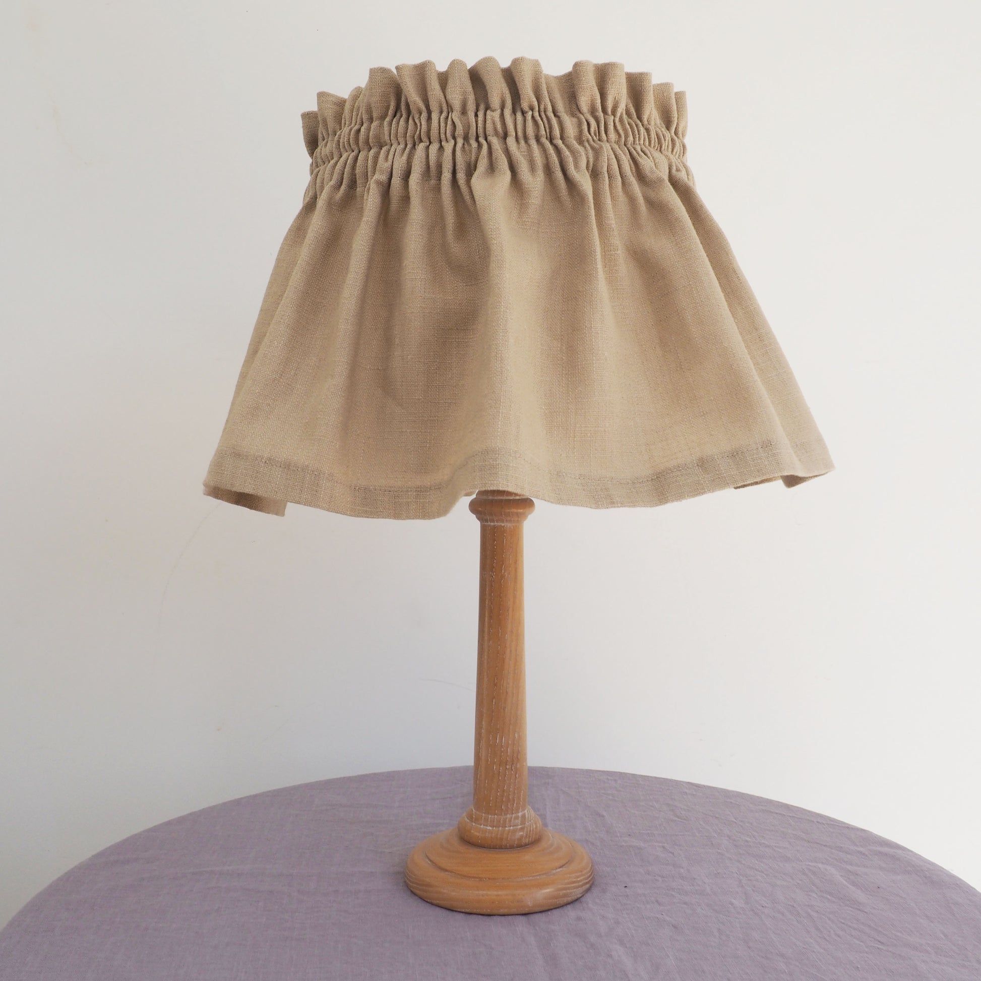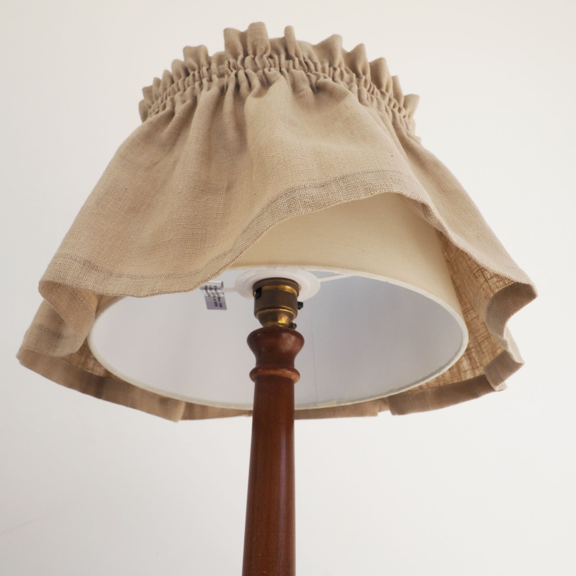 Handmade scrunchie elasticated 100% linen fabric loose lampshade cover skirt in a natural colourway which sits over a plain cream lampshade (comes complete with inner shade).