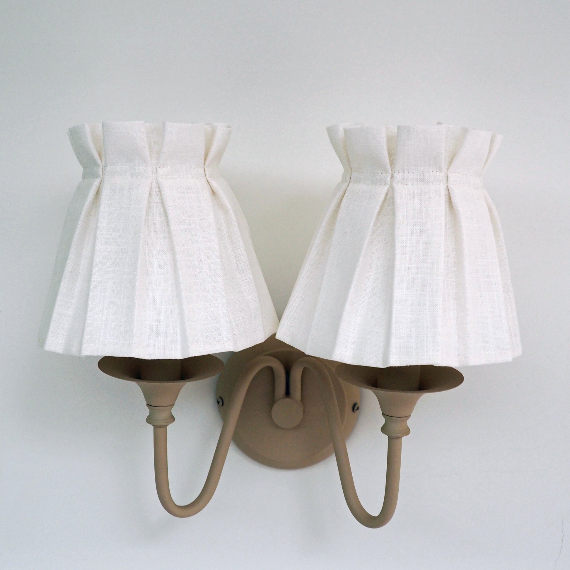 6 x candle clip box 100% linen ivory / off white fabric loose lampshade cover skirt which sit over a plain candle clip shade (comes complete with shade). Candle clip shades sit directly on top of a candle shape bulb
