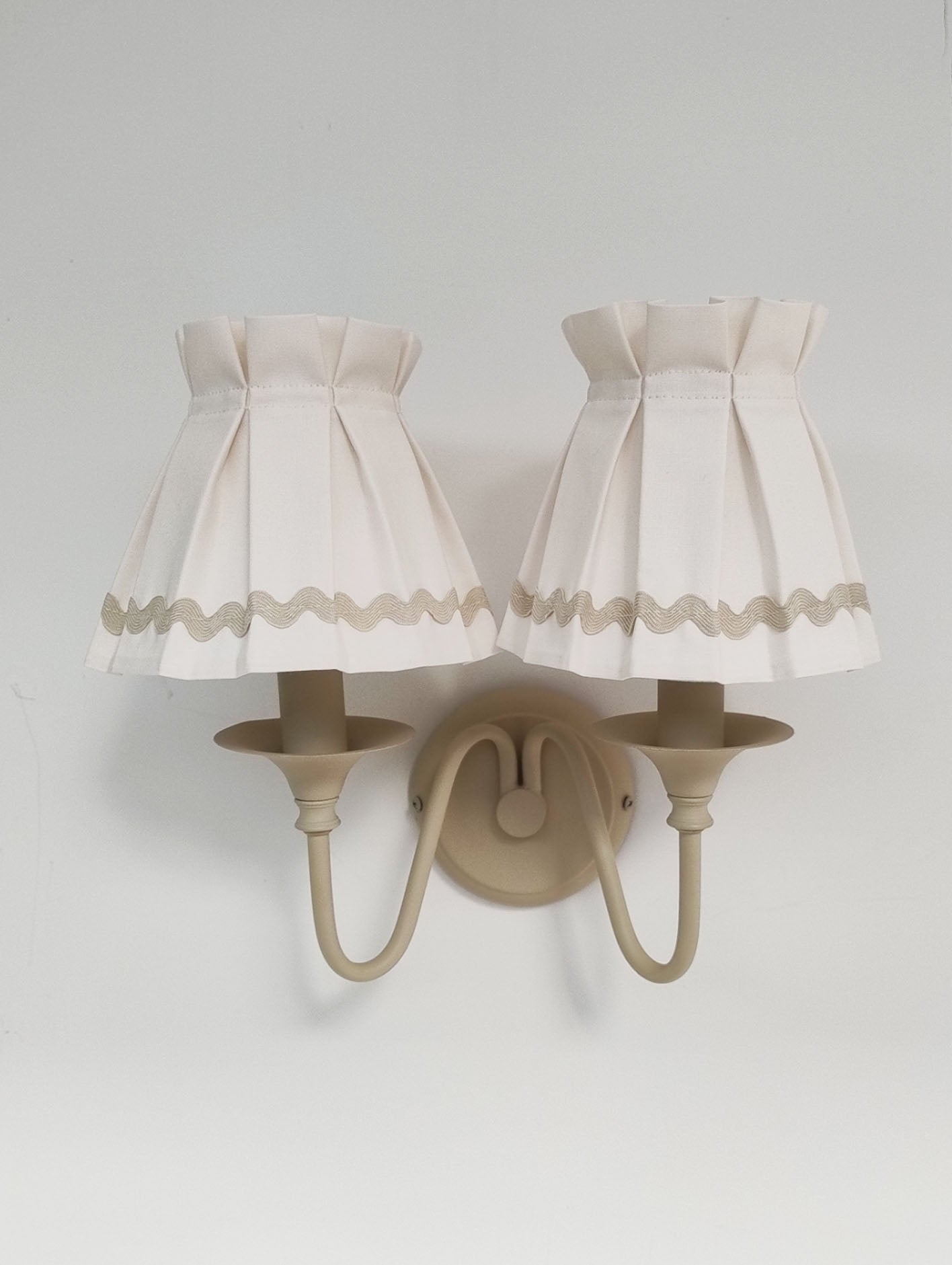 3 x candle clip box pleat ivory lampshade covers with beige ric rac trim. They sit over a plain candle clip shade and come complete with shade. Candle clip shades sit directly on top of a candle shape bulb. Price inc shipping