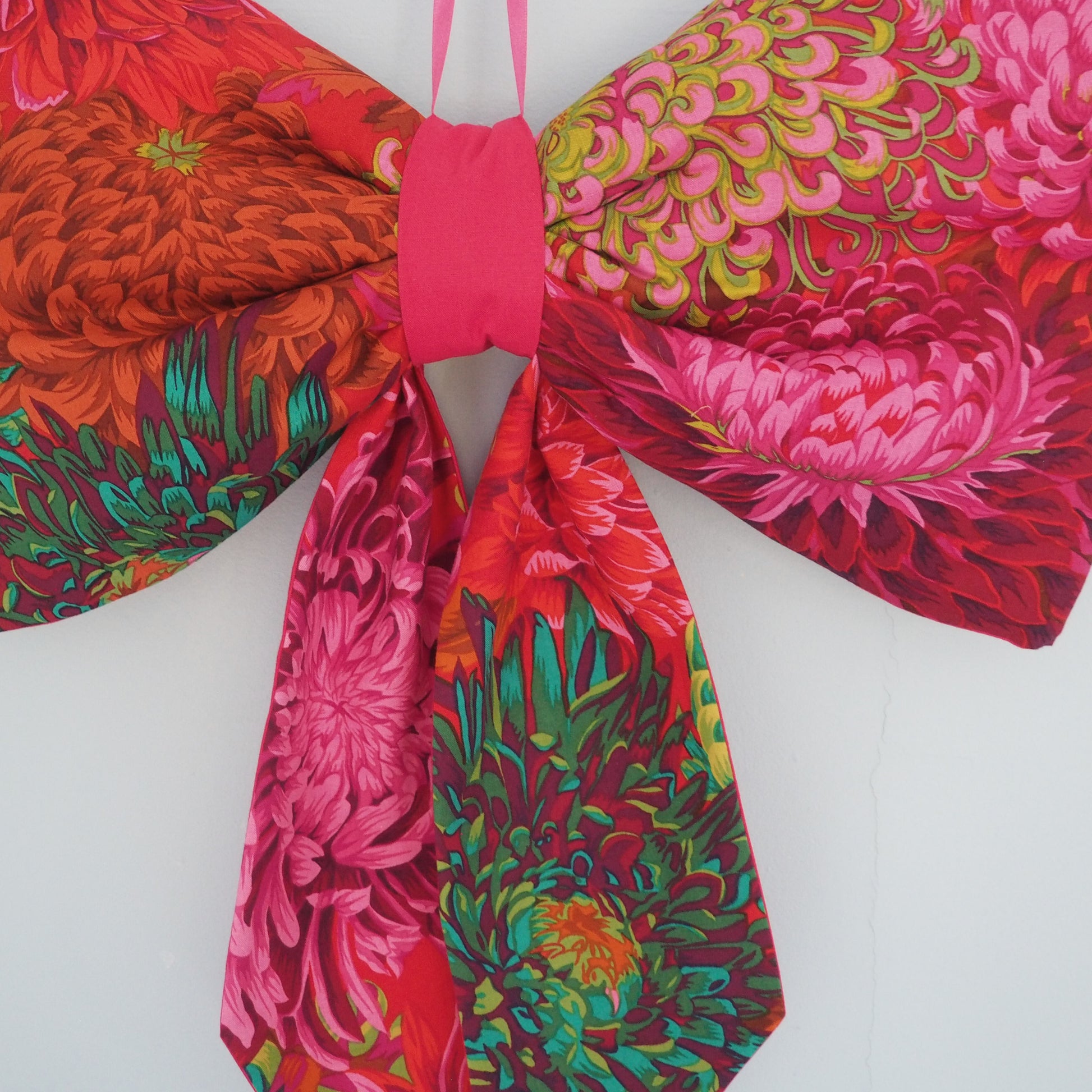 Handmade decorative hanging bow made using Kaffe Fasset japanese chrysanthemum fabric on the front with a plain cerise pink lining. The top bow part is padded for more structure so it keeps it's shape and has a matching ribbon from hanging.