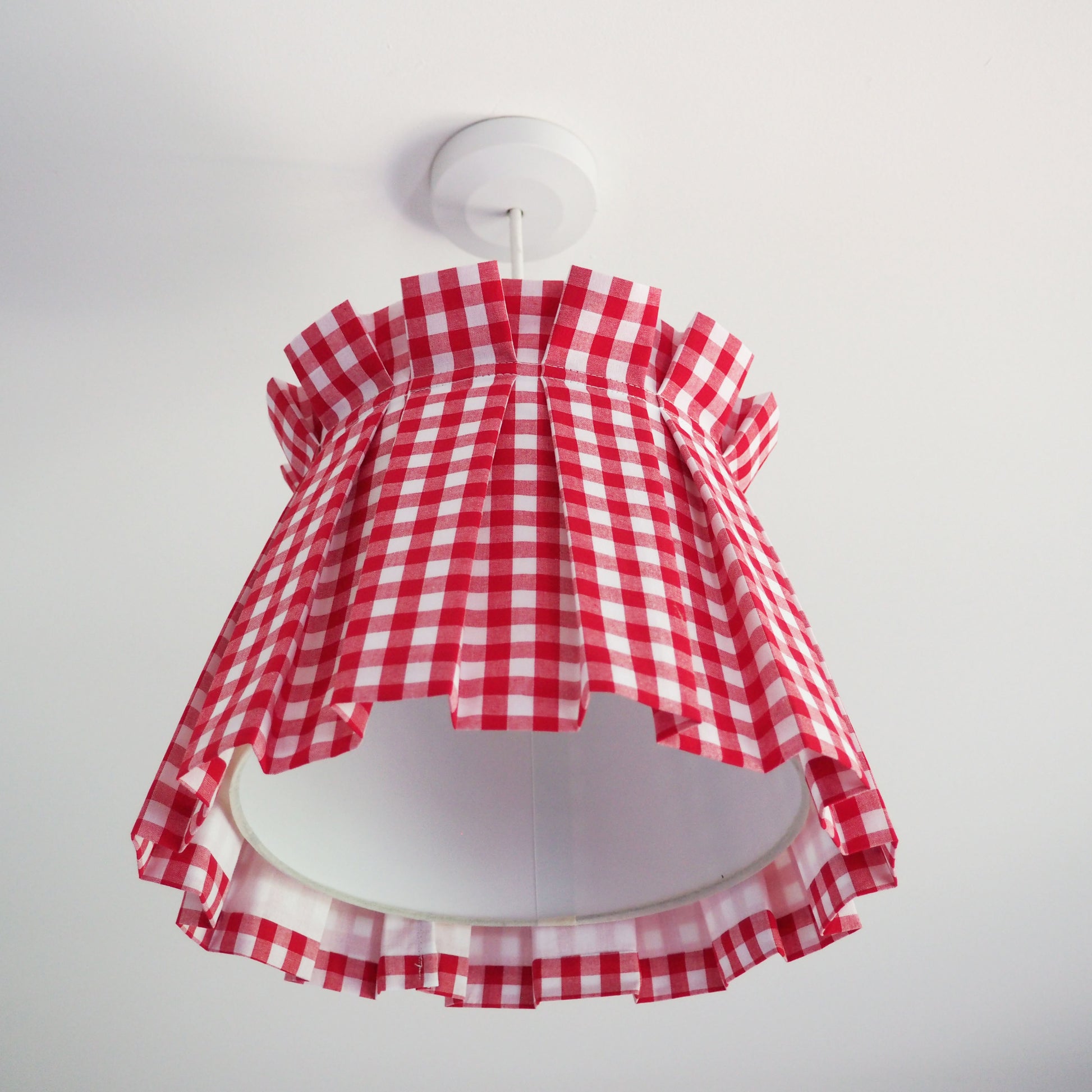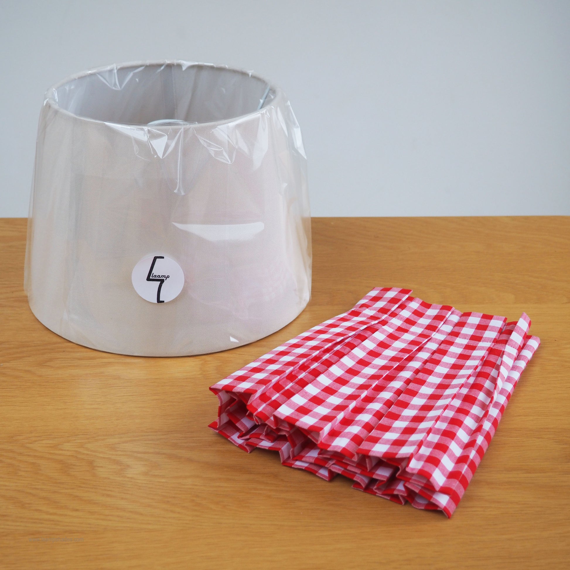 Handmade box pleat red gingham fabric loose lampshade cover skirt which sits over a plain cream lampshade (comes complete with inner shade).
