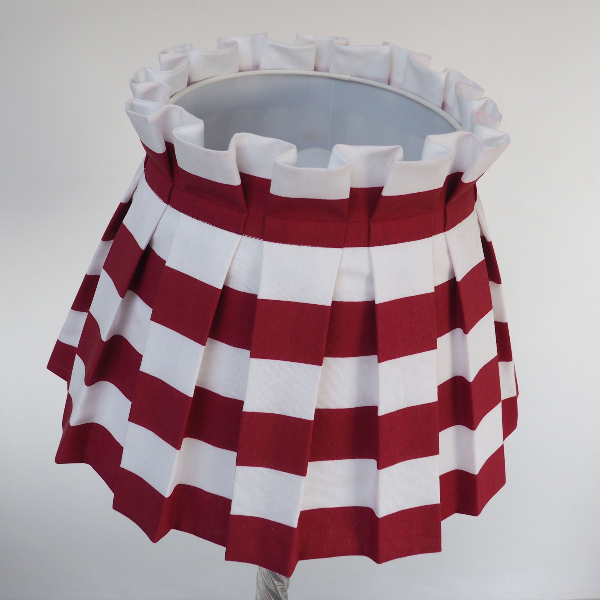 Handmade large box pleat dark red and white stripe fabric loose lampshade cover skirt which sits over a plain cream lampshade (comes complete with inner shade) with reversible gimbal (can be used a ceiling pendant or lampshade).