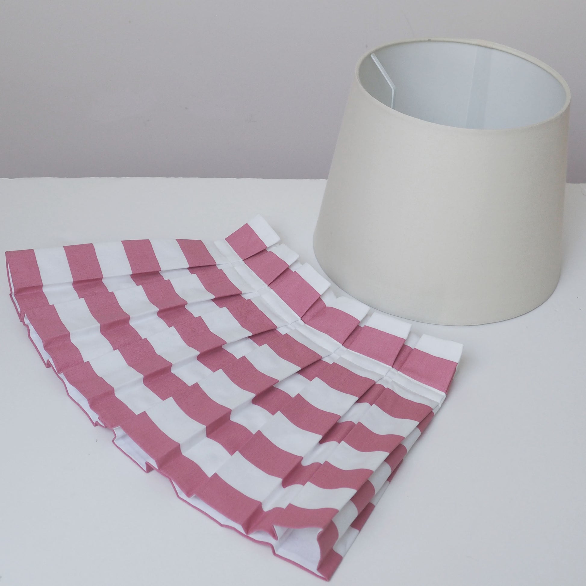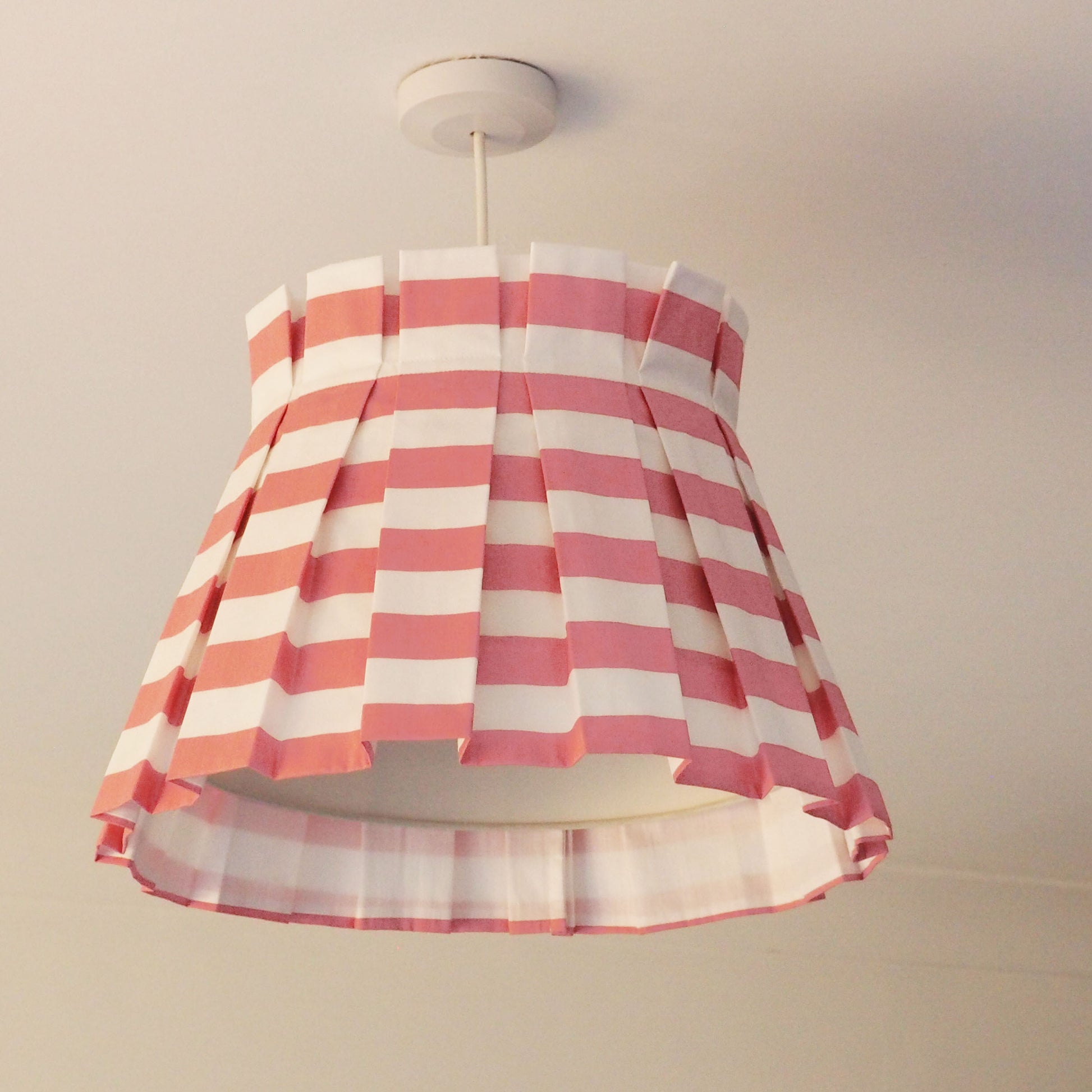 Handmade large box pleat rose pink and white stripe fabric loose lampshade cover skirt which sits over a plain cream lampshade (comes complete with inner shade). This large size works best as a ceiling pendant or on a large round lamp base.