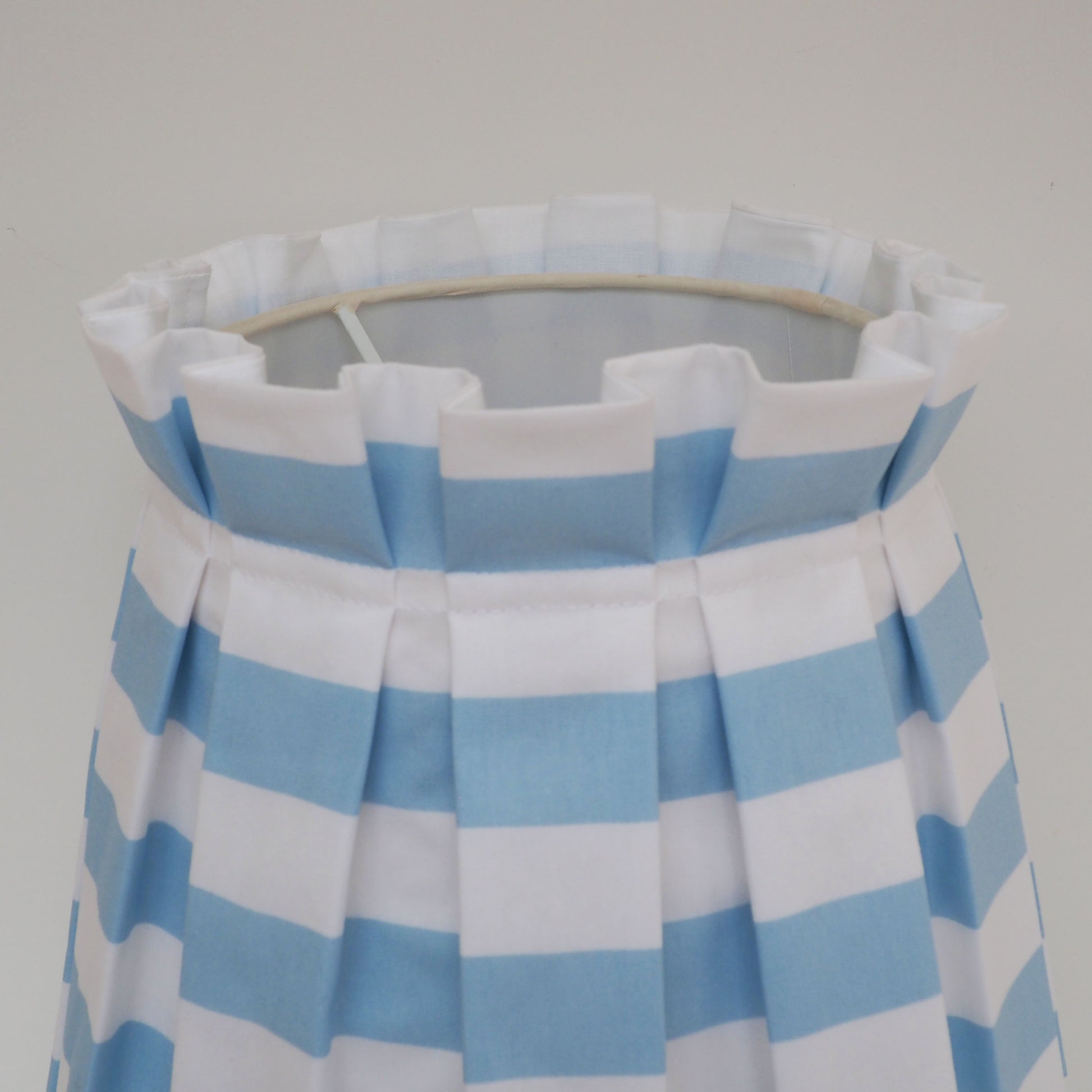 Handmade box pleat sky blue and white fabric loose lampshade cover skirt which sits over a plain cream lampshade (comes complete with inner shade). .